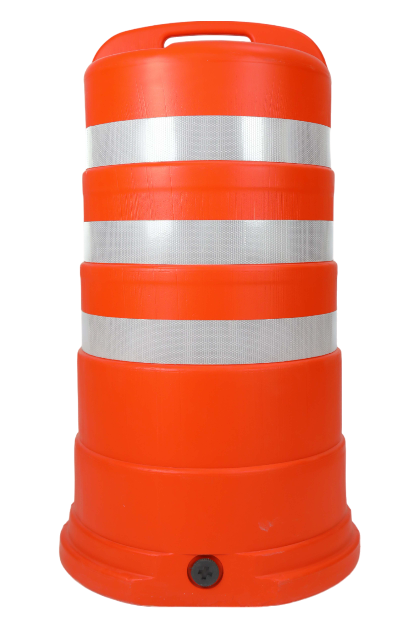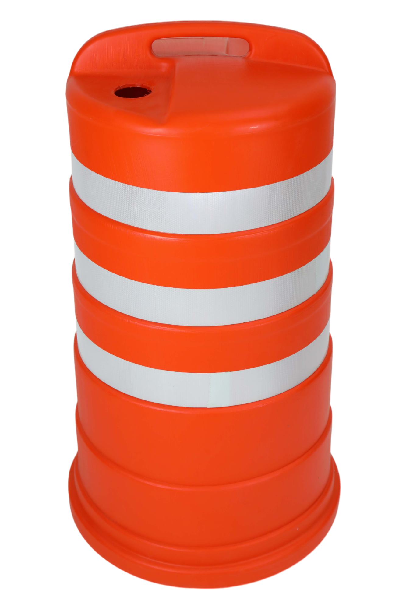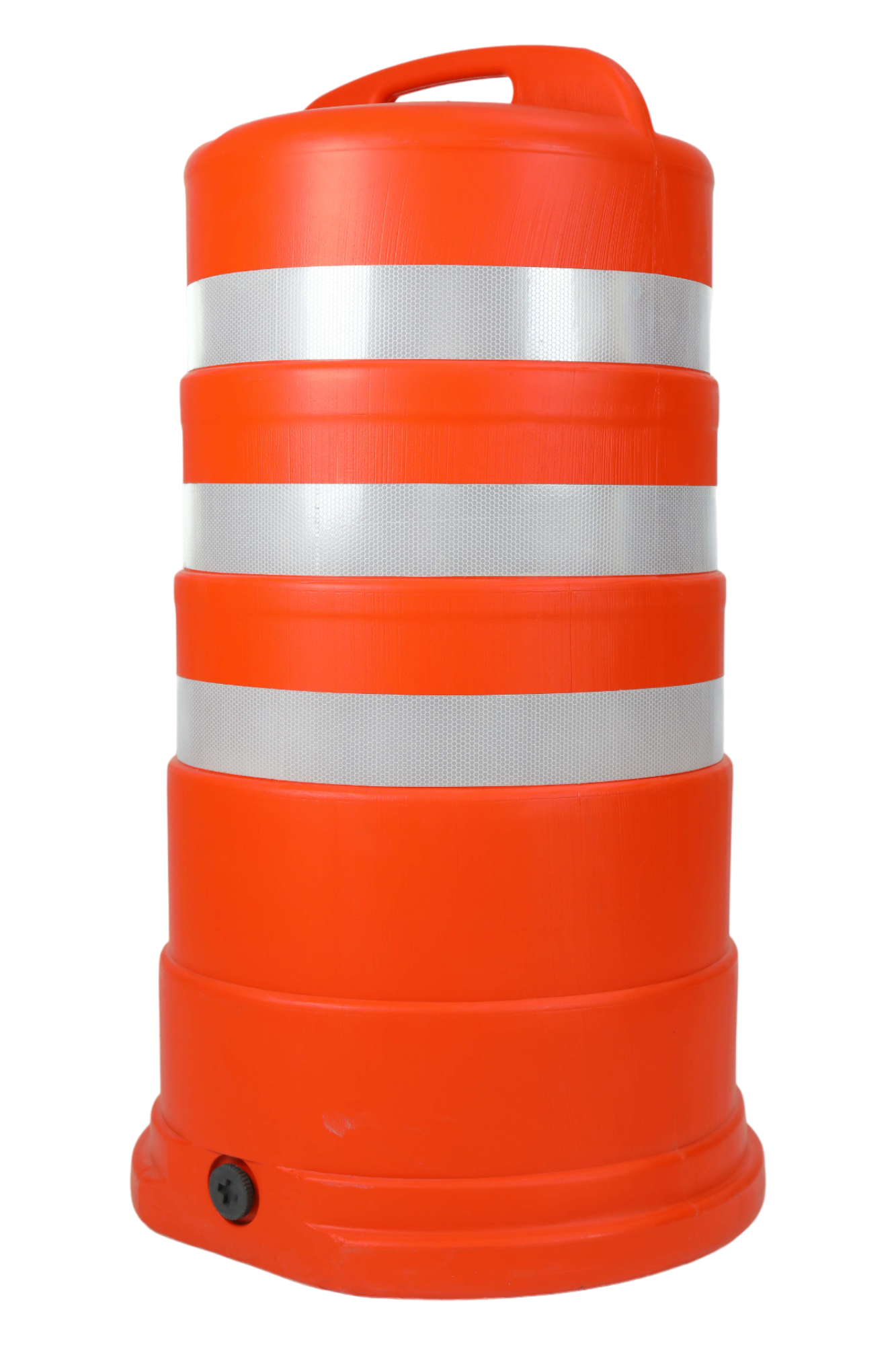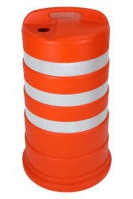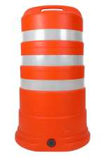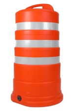 برميل مروري عالي الظهور مصنوع من بولي إثيلين عالي الكثافة (HDPE) مصمم لإدارة المرور وحماية مواقع العمل، قابل للملء ومجهز بسطح عاكس ومقبض للحمل
